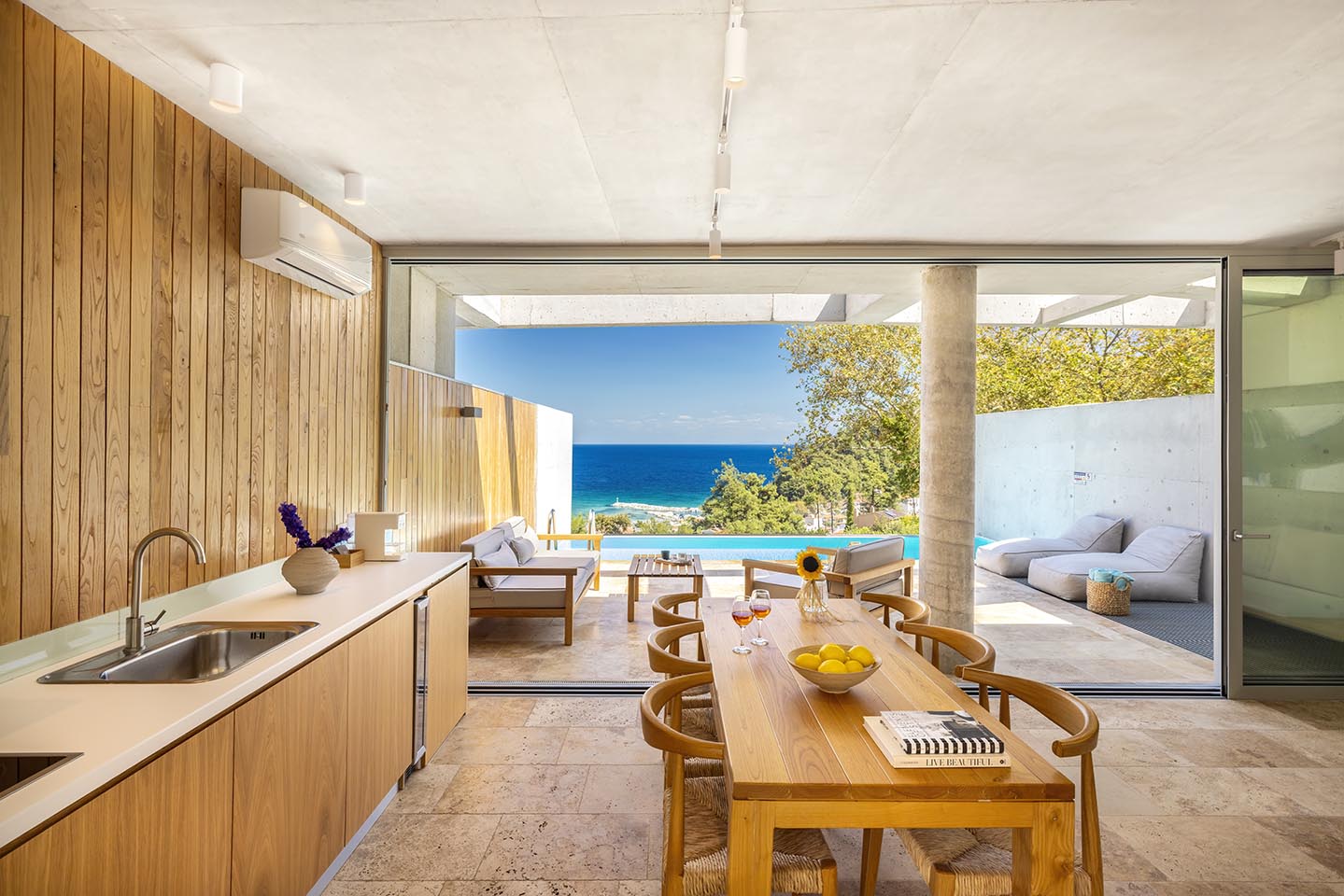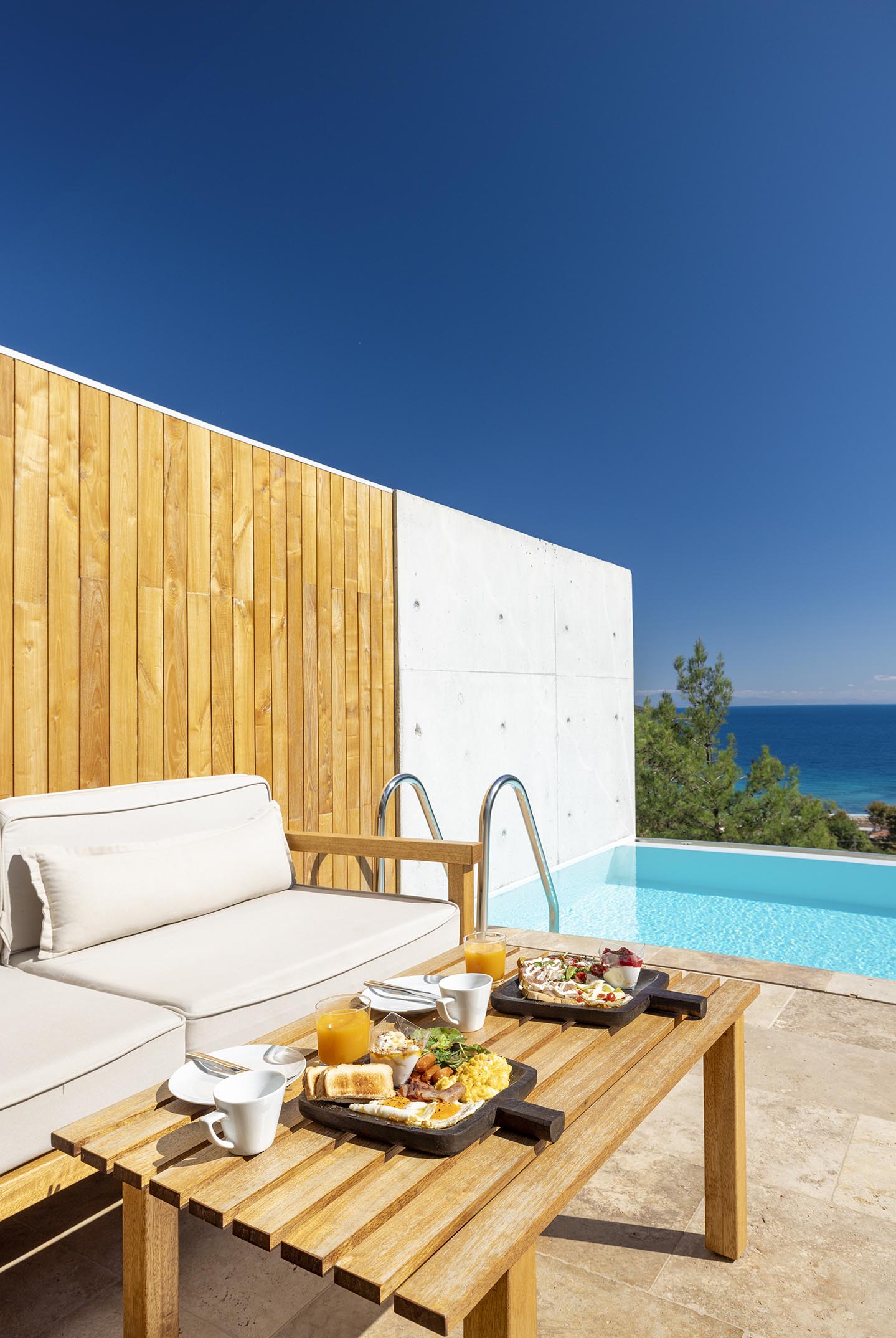 Inspired by their breathtaking surroundings, Two-Bedroom Villas feature an ultra-stylish indoor area of 80 sq.m. and an outdoor area of 110 sq.m. with stunning sea and mountain views and a spacious private heated infinity pool. The first floor of these villas features two independent bedrooms with king-size beds and bathrooms, while the second floor features a living room with a sofa bed and a fully equipped kitchen. Our villa may accommodate comfortably up to 4 adults and 2 children. Here, you’ll experience the best that Thesis Villas have to offer when it comes to your stay.