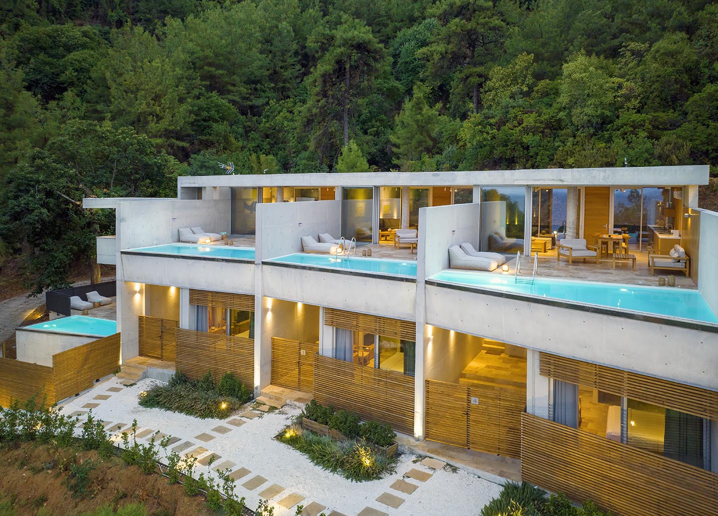 Inspired by their breathtaking surroundings, Two-Bedroom Villas feature an ultra-stylish indoor area of 80 sq.m. and an outdoor area of 110 sq.m. with stunning sea and mountain views and a spacious private heated infinity pool. The first floor of these villas features two independent bedrooms with king-size beds and bathrooms, while the second floor features a living room with a sofa bed and a fully equipped kitchen. Our villa may accommodate comfortably up to 4 adults and 2 children. Here, you’ll experience the best that Thesis Villas have to offer when it comes to your stay.